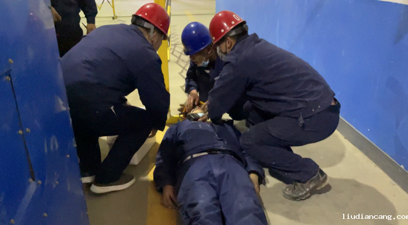 下午2点,演练正式开始。“所有演练人员就位,演练开始”随着演练组长一声音令下,演练正式开始。报告总指挥,“某某正在进行电焊作业,巡检工某某此刻开启了配电箱,只听到“啊”的一声,便立刻倒地”。事故就是命令,总指挥预判到,可能是电源线老化,绝缘皮破损导致配电箱带电。随即安排专业电工立即断电,对伤员立即急救并转移。